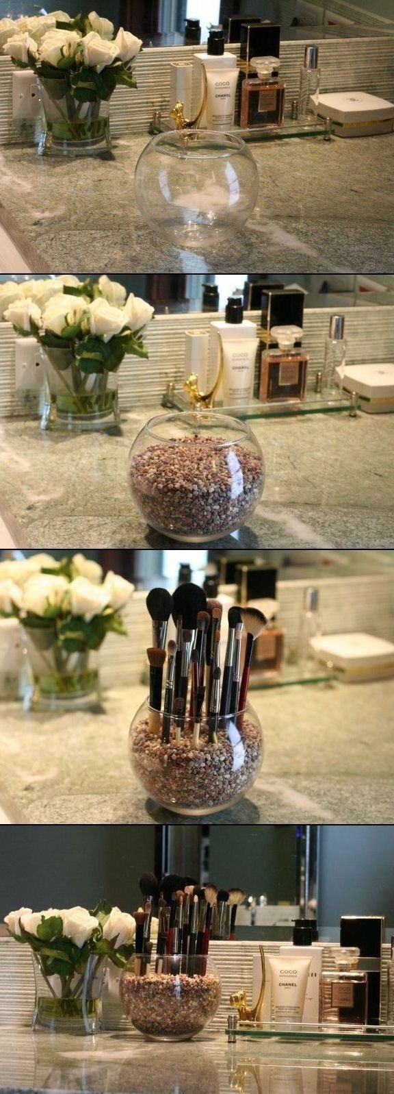 2.Egy két szebb üveg akár kaviccsal töltve remekül megoldja a sminkecsetek tárolását.